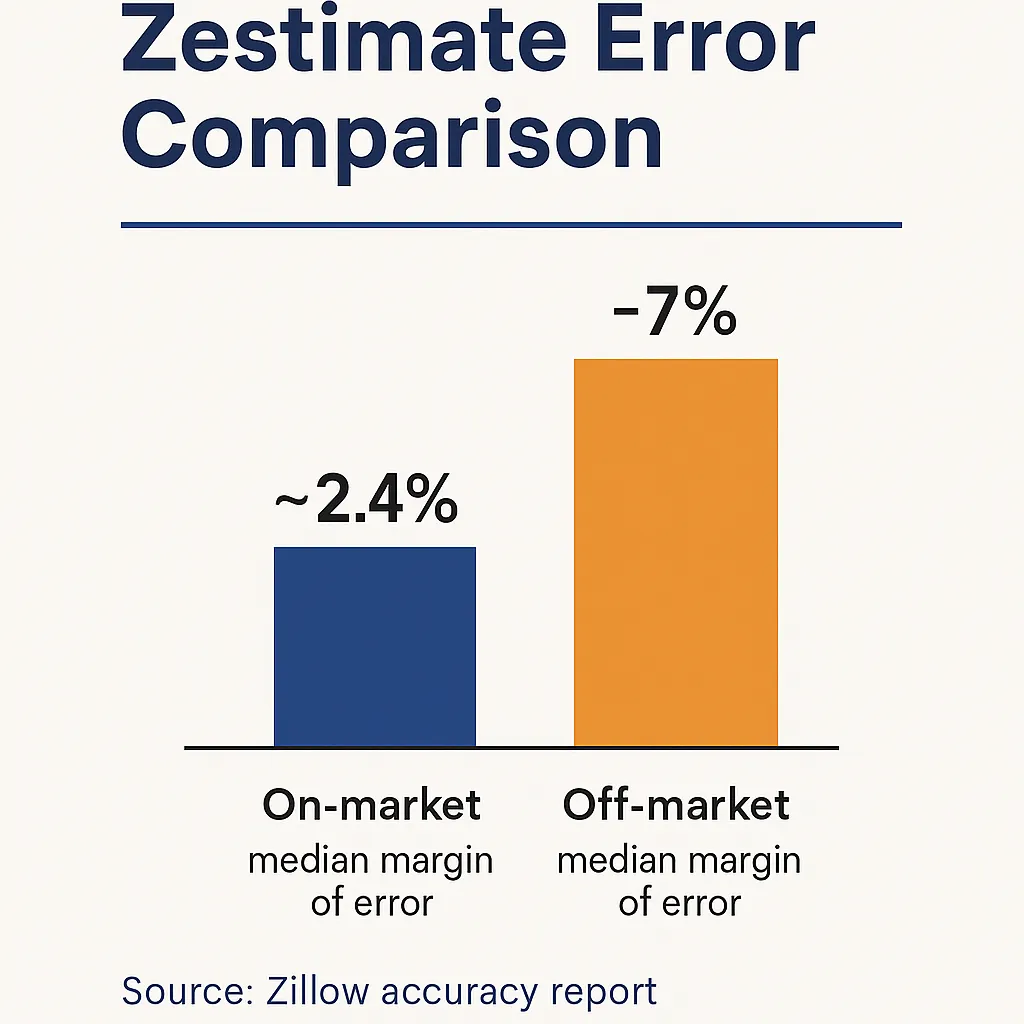 Zillow quotes a median margin of error of ~7.2% nationwide. For properties currently on the market, the error is lower — about 2.4% — but for off-market homes, it balloons.